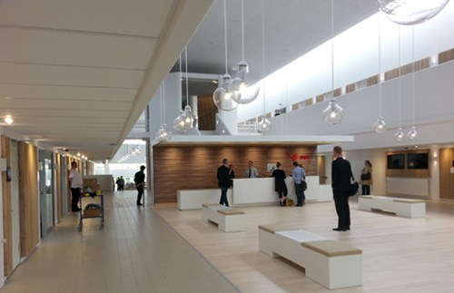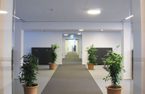 Indretning af kontorlejemål for KLP Ejendomme. Reception og kantine område med nye vægge, lofter og gulve samt installationer.